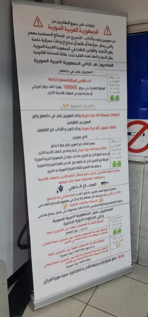 بحسب الافتة في مطار دمشق الدولي هذا ما يمكن اخراجه عبر المطار من ذهب او عملات.